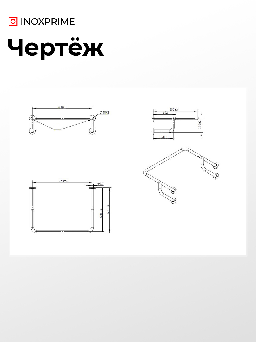 Поручень для раковины настенный, 720×520 мм, Ø32 мм, AISI 304, GRIT 600
