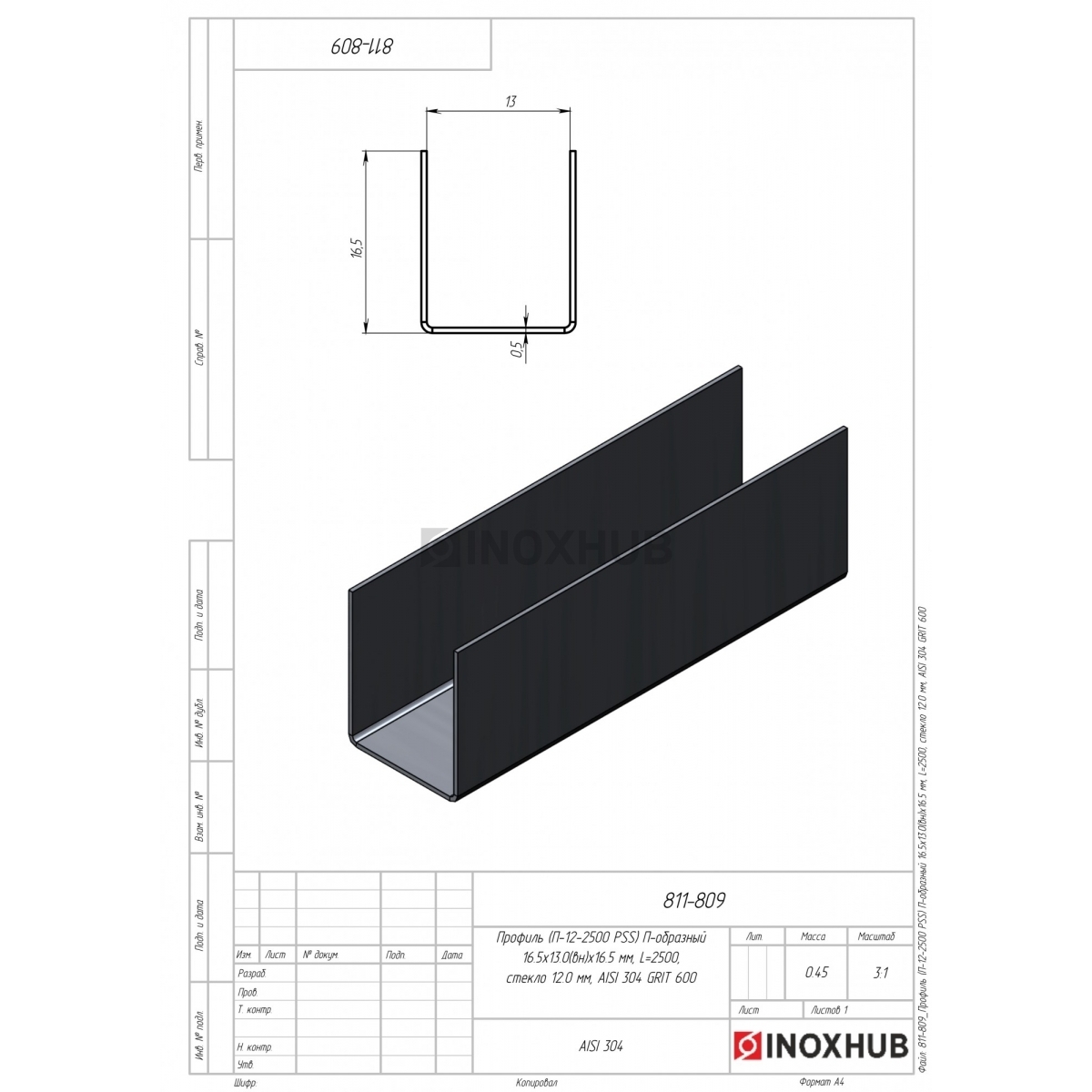 Профиль (П-12-2500 PSS) П-образный 16.5х13.0(вн)х16.5 мм, L=2500, стекло 12.0 мм, AISI 304 GRIT 600