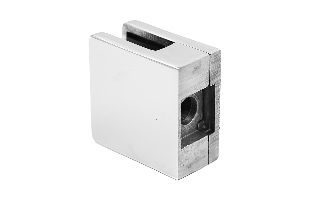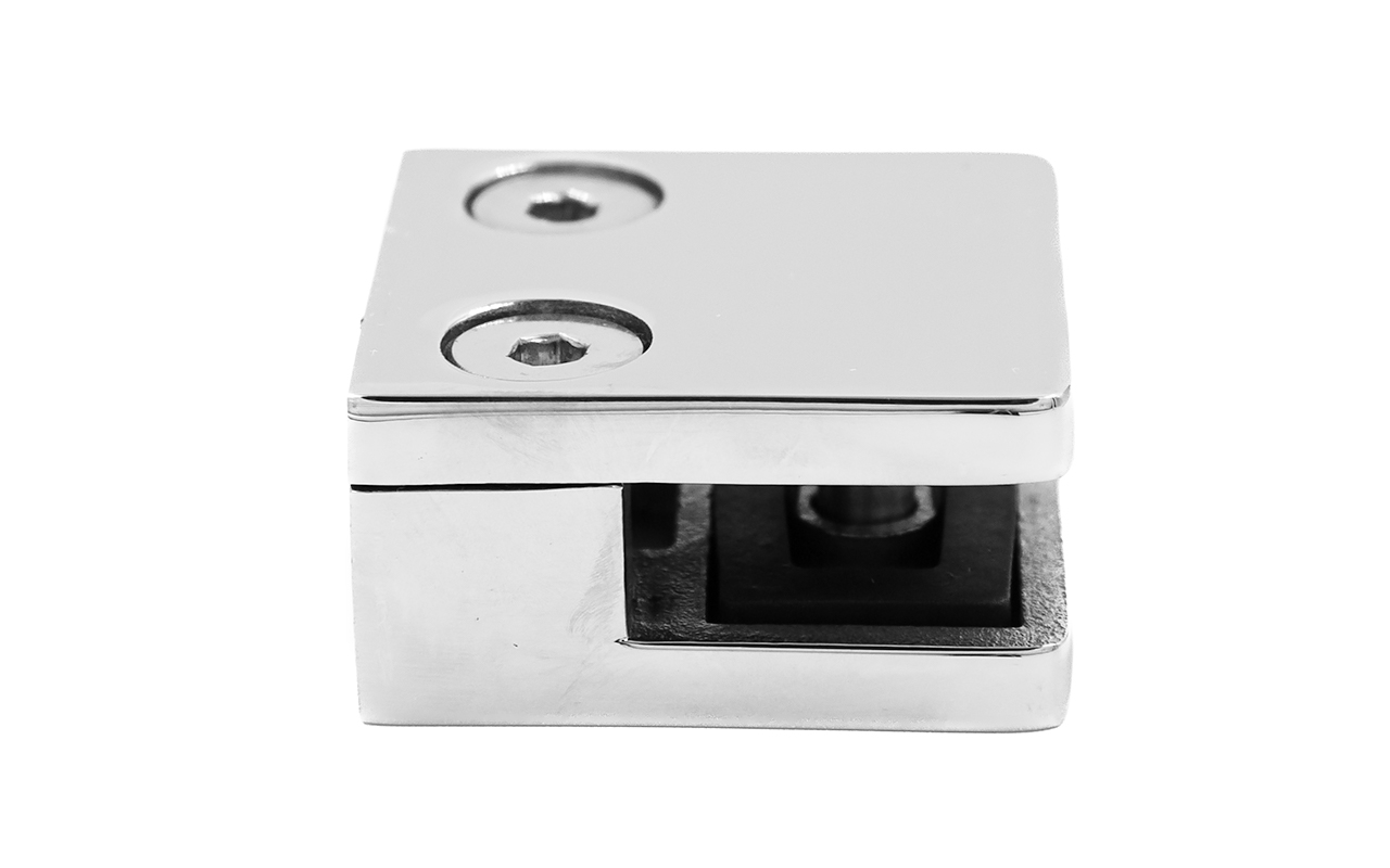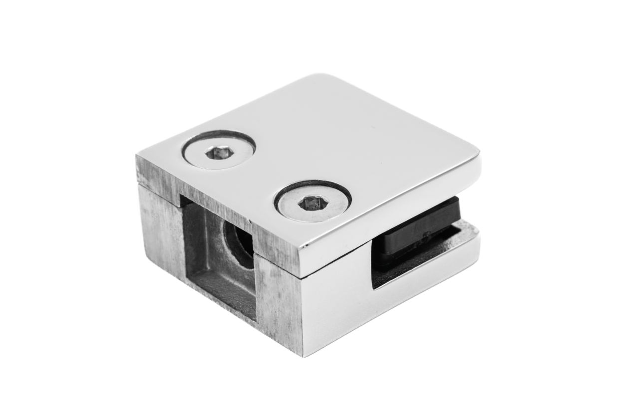 Литой стеклодержатель квадратной формы монтируется на плоской стойке и зажимает стекло толщиной 8 мм. Деталь изготовлена методом литья, что обеспечивает прочное и надежное крепление стекла. Монтируется самостоятельной сборкой и сваркой. Марка стали AISI 304 делает стеклодержатель универсальным, его можно использовать при возведении ограждениях как на улице, так и в помещении